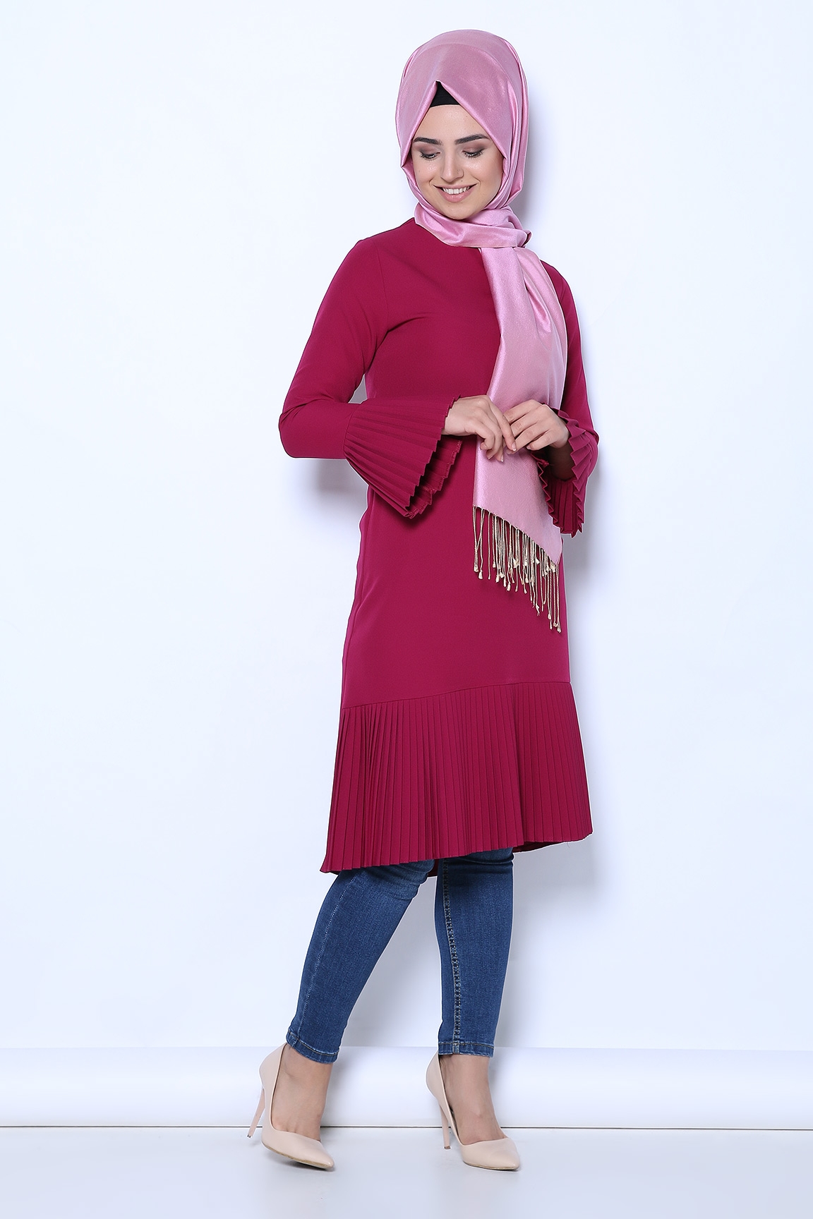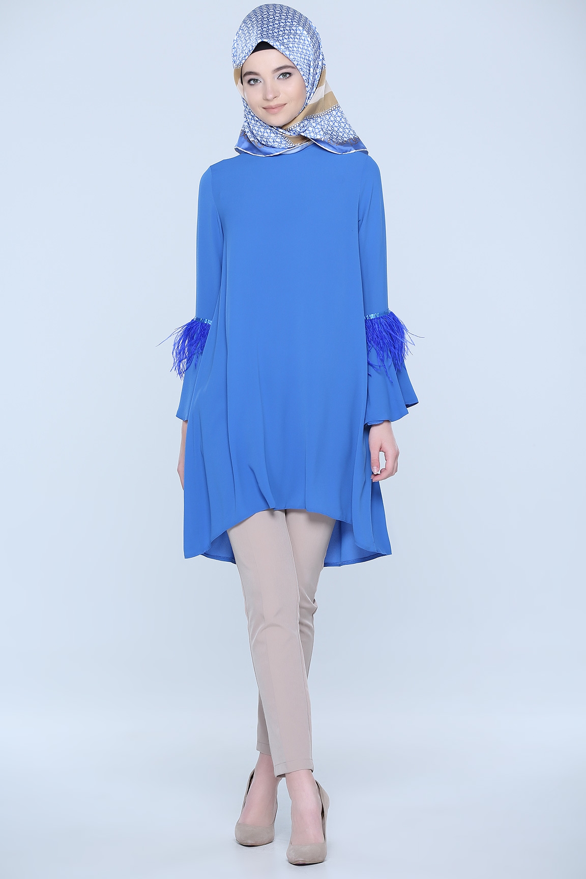 Diesre’de desensiz, tek renk kumaşlardan tasarlanmış tunikler birbirinden farklı detaylarla hareketlendirilmiştir. Pembe, kırmızı, mavi, beyaz, turuncu, siyah, mor, lacivert gibi birçok renkte tunik alternatifi mevcut. Düz renkli tuniklerin bir kısmı pelerinlerle hareketlendirilmiş. Pelerinle çok şık görünen tunikleri özel günleriniz için de kullanabilirsiniz. Kollara fırfır detayı verilen, fermuar detayına yer verilen ya da fular eklenerek farklı bir hava katılmış çok sayıda modelde tuniği Diesre’de görebilmeniz mümkün.